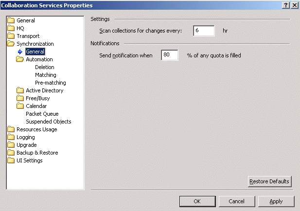 The main task for Collaboration Services is keeping Active Directory data, calendar, and free/busy information synchronized between all synchronization partners so that users have access to up-to-date information about all objects participating in the collaboration. Use the synchronization settings to: