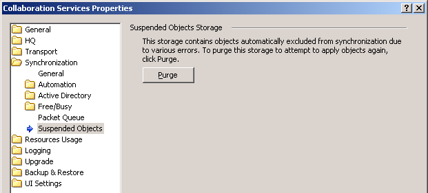 Once the problems have been fixed, open the Suspended Objects page in the Collaboration Services properties and click the Purge button to empty the Suspended Object Storage. This will add the excluded objects back into the synchronization queue to be processed again.