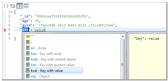 Once you open JSON Editor, you can invoke Content Assist to utilize JSON templates. Instead of worrying about closing brackets and quoting keys properly, you can simply insert the key-value structure and just fill in the values.