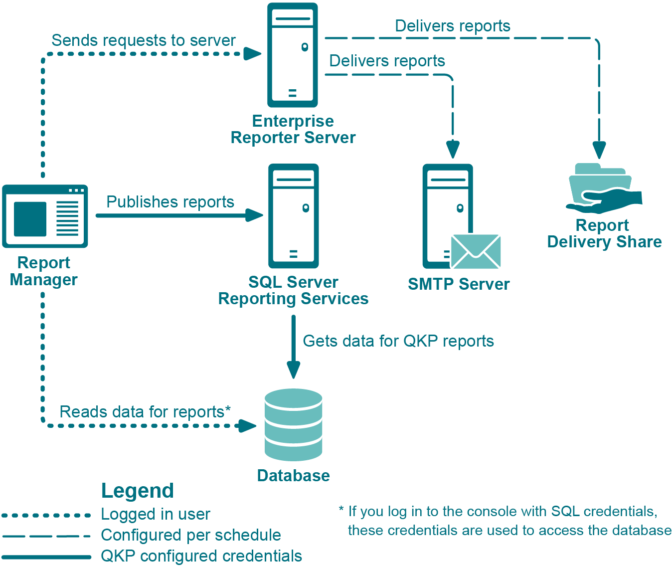 The Report Manager needs to be able to access both the Enterprise Reporter server and the Enterprise Reporter database, as shown in Figure 1.