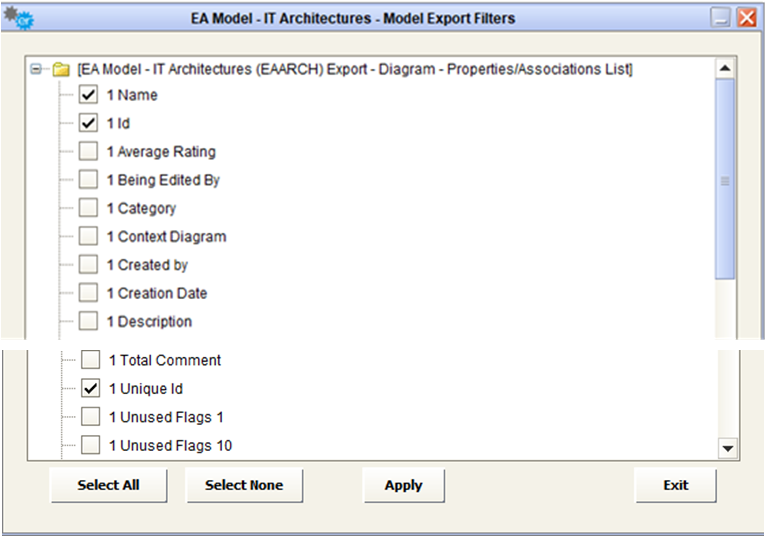 It’s also possible to choose which Properties/Associations extract through an EA Adapter for the selected object type. The “Source Filters” button allow user to pick only the desired information from a model, while default operation includes all of them.