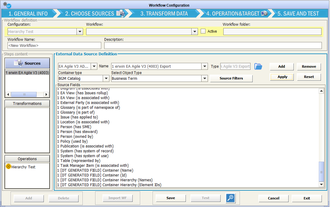 2.Choosing applicable data sources, and providing normalization parameters (like name of the sheet for Excel files, or the object type to extract for an EA/EA Agile Adapter)