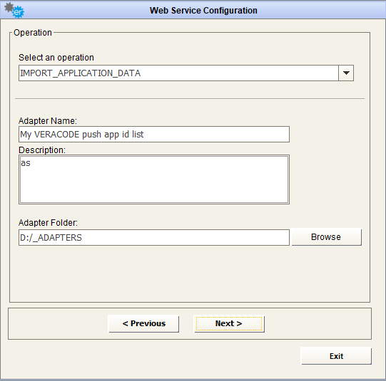 The  button steps into the next window that shows the available operations of this Web Service; choose “IMPORT APPLICATION DATA”, to configure an adapter that can be used in a workflow to push application metadata to Veracode (see later).
