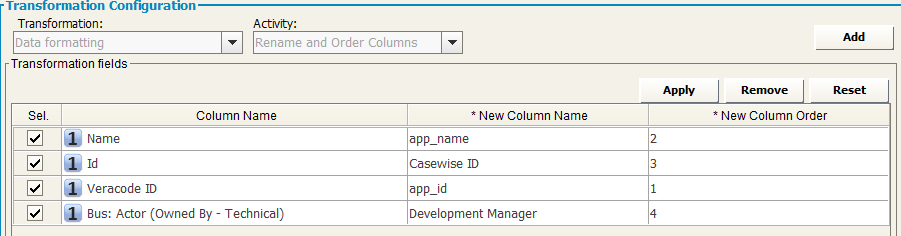 The Adapter, as mentioned, can be used to push data to Veracode and fill applications metadata. For example, if the application object type in Veracode has two custom fields named “Casewise ID” and “Development Manager”, the alignment can be done configuring a workflow, with a source providing values for the fields, and with the target operation “Web Service POST”, using the configured adapter. To provide mappings between source and target field, use a “Data Formatting: Rename and Order Columns” transformation, with the required “app_id” and “app_name” fields, and all others desired fields. Where “app_id” (numeric) value is null or 0, the application with provided name will be created, or updated, if an existing Veracode application with the same name already exists.