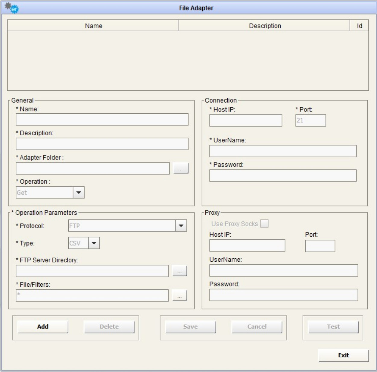 The first group of fields in the window relate to the File Adapter List, which lists all the File Adapters available.
