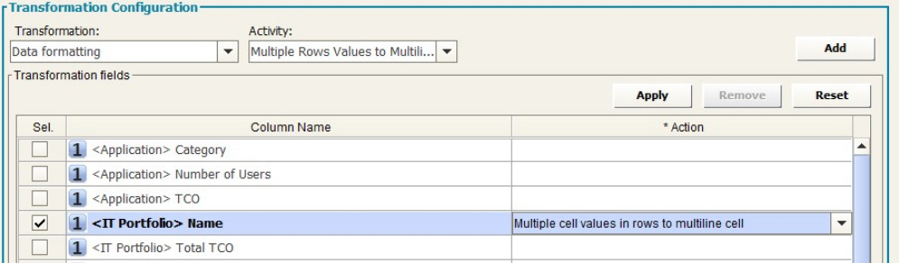 The “Selected Value in List” Transformation applies if it there is a column containing a multiline text, as when exporting from a CM model an object and a list of associated objects, and it’s needed to have a single item of that list, either the first or the last. The user can set the option on the source column, choosing between “First value in List”, “Last value in List”. All these configurations may be done separately for each source field.