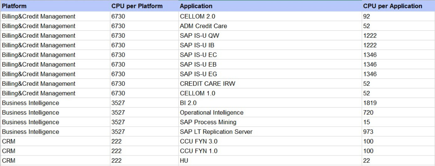 Typical use case: A model contains a technical chain from server with number of CPU, associated to IT services, associated with application, aggregated in platforms: exporting the two intersection object types, and using the “Sum Values in Rows” for association between servers (with CPU) and IT Services, collecting the CPU for IT Service in the first dataset (association between platform and application), using the IT service as key in “Match keys and pick values” transformation, this output can be obtained: