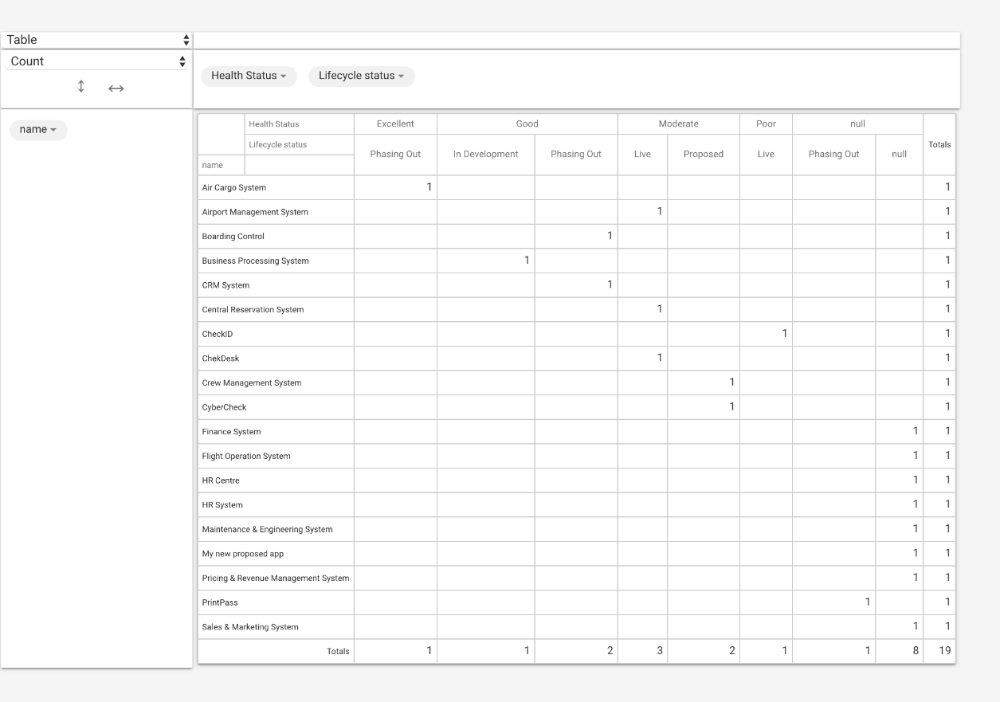 The pivot table provides the ability to slice and dice your objects by their attributes. Attributes are simply dragged and dropped into the Table to create Row & Column headers.