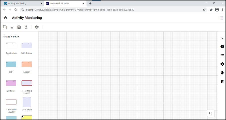 Evolve Web Modeler editor opens in the new tab with the predefined Shape Palette of the template chosen.