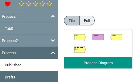 The Published menu displays all the published diagrams for the specified object type. Drafts can be viewed in Tile view, or Full view. Hovering over the draft will reveal the diagram controls: