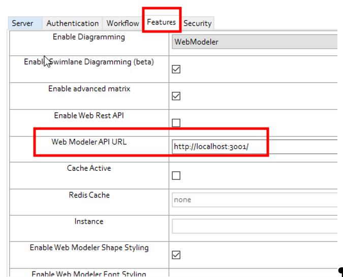 4.Click Features and in the Web Modeler API URL box, replace your host IP address with "localhost".