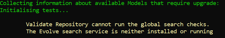 If erwin Evolve Web Platform is not installed, the Validate Repository feature runs without Global Ssearch checks. You will receive a warning if erwin Evolve Web Platform is not installed. However, this does not affect any of the other tests.