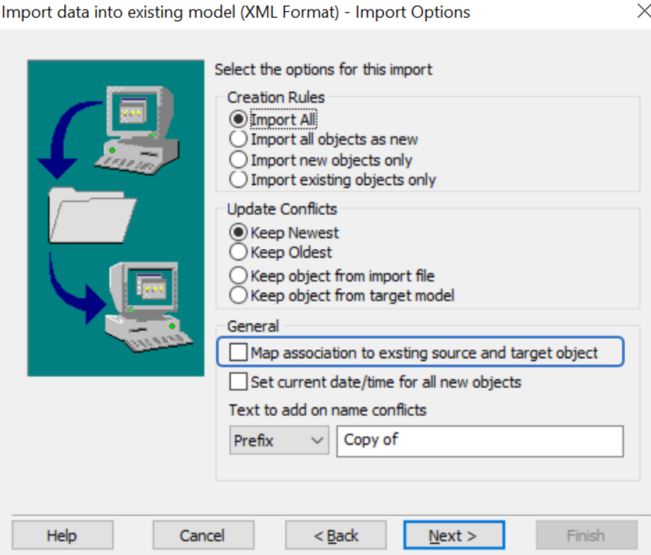 When importing data into an existing model using the XML file import format, the user can now [2020.1.1] choose to map associations by the source and target object for an existing user-defined association, as opposed to by the Unique Identifier.