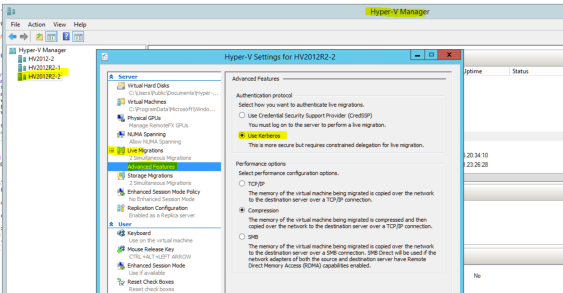 In Hyper-V Manager, select the Hyper-V server and settings. Then, go to Live Migration and Advanced Features. Then, select Use Kerberos under Authentication Protocol.
