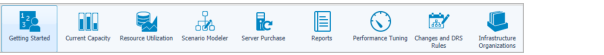 The Menu bar contains the following tabs: Getting Started Tab, Current Capacity Tab, Resource Utilization Tab, Scenario Modeler Tab, Server Purchase Tab, Report Tab, Performance Tuning Tab, Changes and DRS Rules Tab, and Infrastructure Organizations Tab.