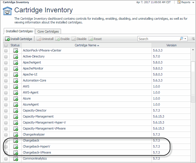 Start by installing the .car file containing Foglight Chargeback using the Cartridge Inventory dashboard. The cartridge must be enabled to make use of cost models and to generate reports. For complete information about installing and enabling cartridges on the Foglight Management Server, see the Administration and Configuration Help.