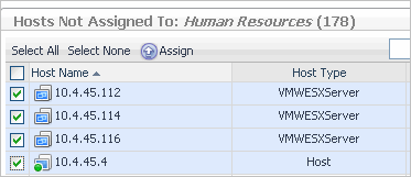 Hosts Not Assigned To—this table shows all the hosts that are not assigned to the selected group. To add a host to a selected host group, choose the host you wish to add and click the Assign button from the toolbar. This moves the host into the Hosts Assigned To table, and associates the host with the host group that was selected. Each column in the table can be sorted based on individual preferences. |