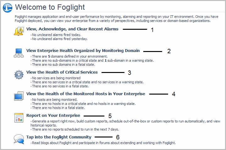 This section provides an introduction to the Foglight Administrator’s version of the Welcome page. For details about this page, see the Administration and Configuration Guide.