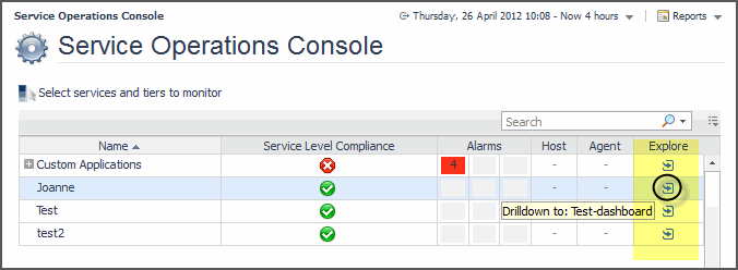 Once set, you can view this drilldown view from the Service Operations Console dashboard by clicking the icon for this service in the Explore column.