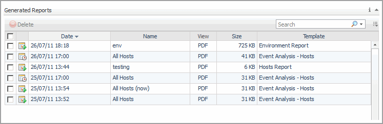 TIP: Show or hide columns in the views using the dialog box that appears when you click the Customizer icon ().Quickly find a report in one of these views using the Search field. You can also click the Search menu to perform an advanced search or use regular expressions.