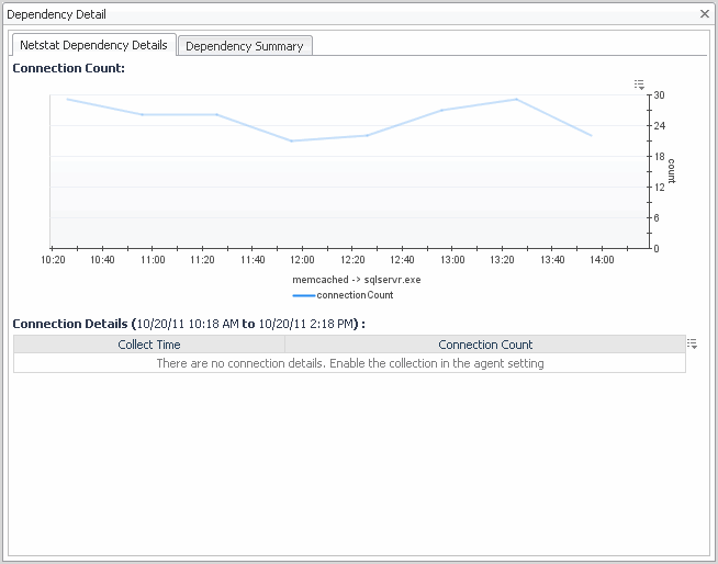 Netstat Dependency Details view shows the connection count for the selected Netstat agent, when applicable. Other types of dependencies may show other details. These details are optionally collected, based on the advanced settings configured for the agent.