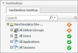 When you open a dependency map, the XenDesktop Desktop tab appears on the navigation panel. This tab displays a a navigation tree representing a simplified map of your monitored objects. On the right of each object or object group, alarm indicators appear. Each indicator represents the alarm of the highest severity that is generated against the object. For an object type container (for example, All DeliveryGroups), the status indicator represents the alarm of highest severity that is outstanding for all objects belonging to that group.