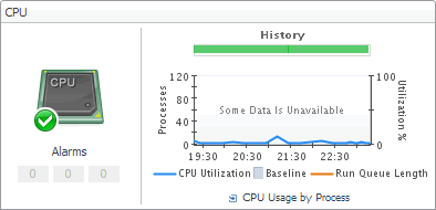 For virtual desktops, the CPU view displays the CPU Load spinner indicating the current percentage of the selected virtual machine’s CPU load, used to execute system code and user programs, based on the total CPU capacity. The % Used line in the CPU Utilization chart shows the percentage of the CPU utilization used by the virtual machine to execute system code and user programs, during the selected time period. % Ready displays the percentage of the virtual machine’s CPU resources that are ready to execute system code and user programs during the selected time period. The Baseline area in the chart indicates the expected CPU utilization range based on historical data. For physical desktops, the CPU Utilization line in the chart shows the percentage of the CPU utilization used by the physical machine to execute system code and user programs, during the selected time period. Run Queue Length displays the number of processes that are waiting to be executed, during the selected time period. The Baseline area in the chart indicates the expected CPU utilization range based on historical data. The History bar appearing above the chart indicates the alarm state of the selected desktop’s CPU resources over the selected time range period. The color of the bar changes over that period depending on the alarm state. Red indicates that the selected component is in Fatal state, orange indicates Critical, yellow means Warning, and green is for the Normal state. | |
