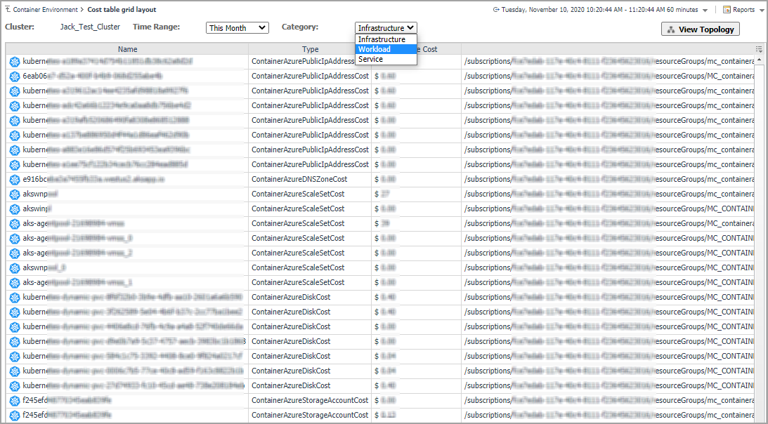 The Cost Table lists the detailed cost information calculated by different categories, including Infrastructure, Workload, and Service.