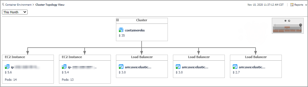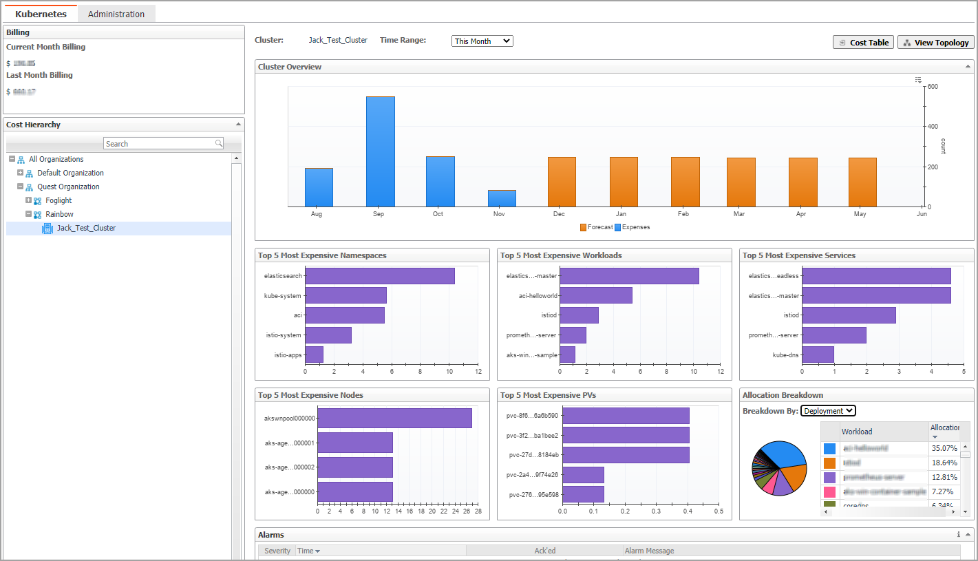 Cluster Overview: The monthly cost aggregated from all the clusters of the organization and the forecast aggregated cost for the continuing months.