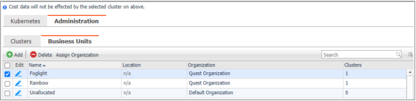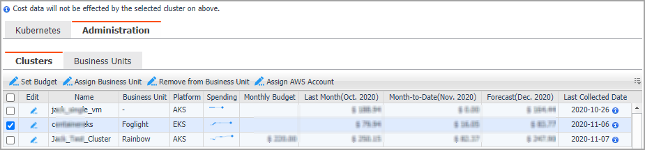 Kubernetes clusters are collected by Kubernetes agents. By default, clusters will not be assigned to any BU and do not have a default monthly budget.