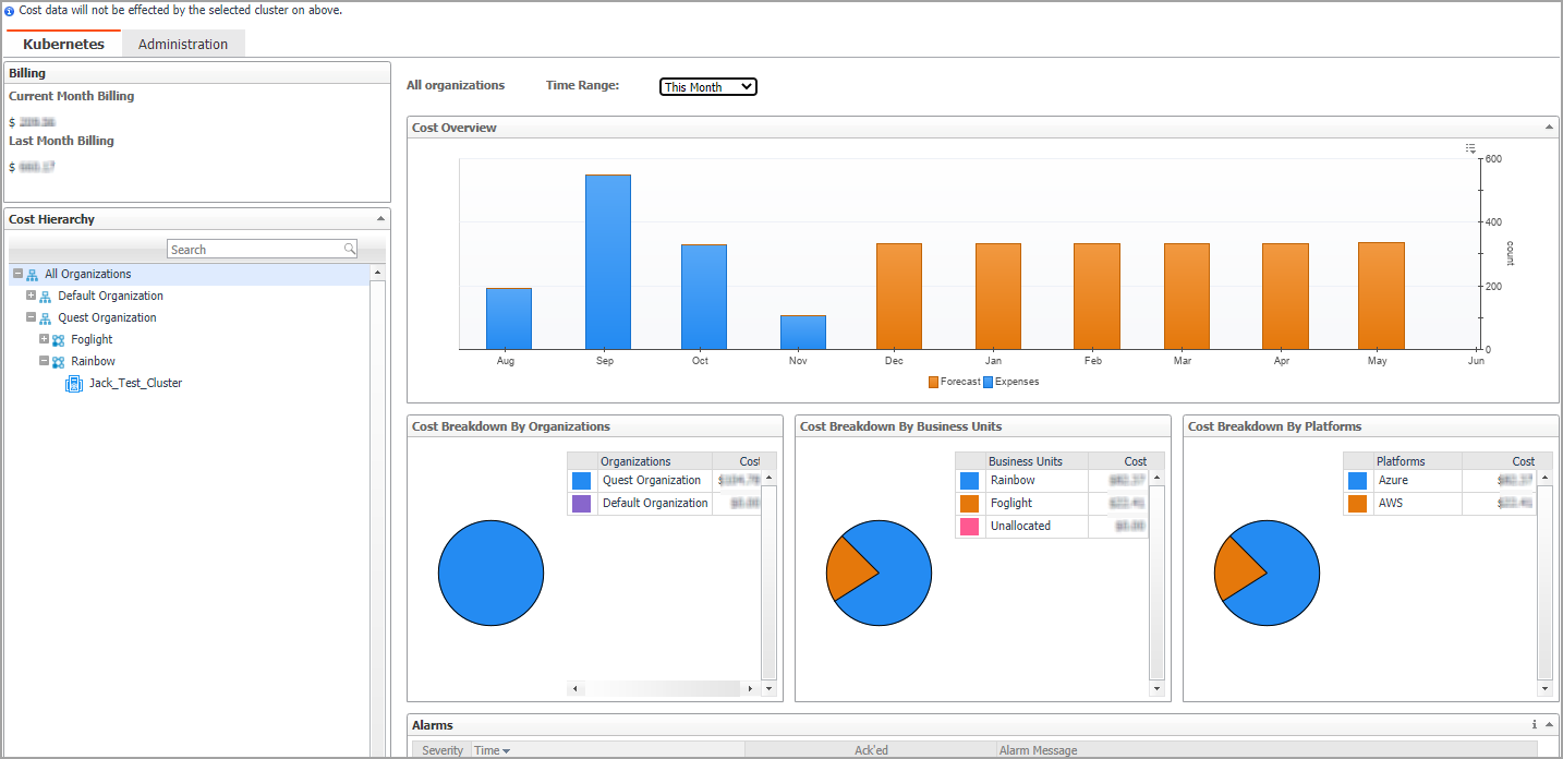 Cost Overview: Monthly cost aggregated from all the clusters and the forecast aggregated cost for the continuing months.