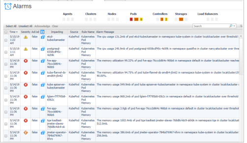 The Alarms dashboard displays a list of alarms generated against the monitored Kubernetes environment. Use this view to quickly identify any potential problems related to a specific Kubernetes component.