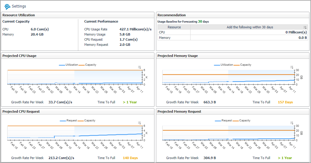 NOTE: If a value Never is displayed at Time to Full, which means the usage/request trend is declining and the usage/request will never reach the capacity.