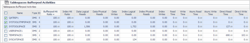 Provides the metrics required to monitor tablespace buffer pool activities and can be sorted according to the buffer pool hit ratio.