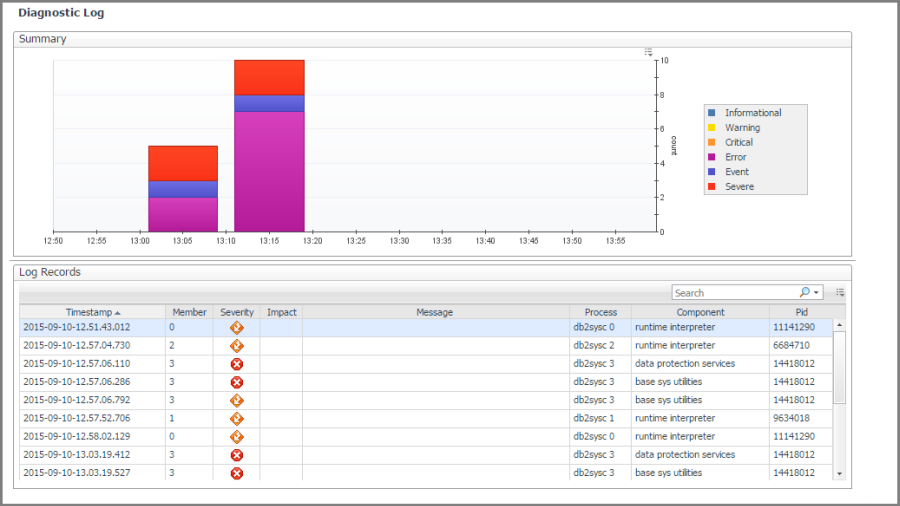The Log drill-down provides a diagnostic graph and log of database log activity. Records displayed are those configured in the Diagnostic Log administration screen.