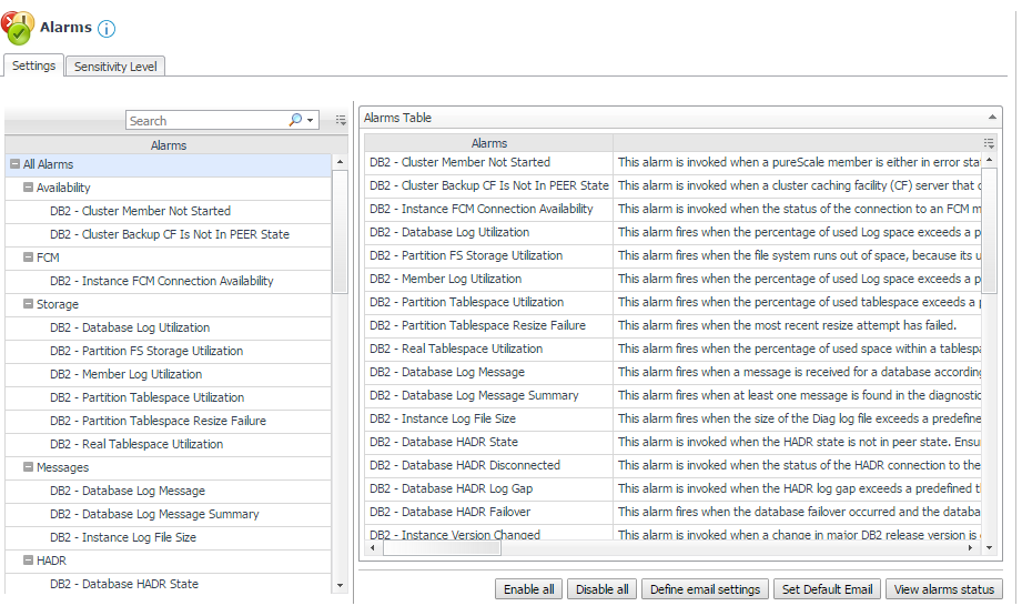Foglight for DB2 LUW has four sensitivity levels that control which alarms are reported: