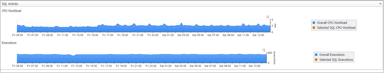 The SQL Activity pane displays the CPU workload and executions of the selected SQL statement, as well as all SQL statements displayed in the History Tree on the page left side. This pane is identical to the SQL Activity section in the SQL Statements Page.