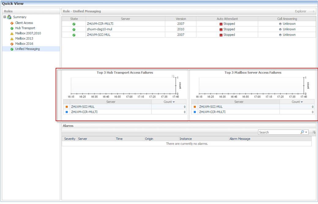 The Unified Messaging Role Environment Summary view displays the Exchange features and the role status per server. It also provides additional metrics and information that pertains to the selected Exchange role.