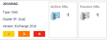 The Exchange Cluster Environment Summary view displays a cluster tile for the selected cluster that lists the active and passive nodes or databases included in the selected cluster. In addition to the cluster tile, this view displays more detailed environment information about the Exchange cluster.