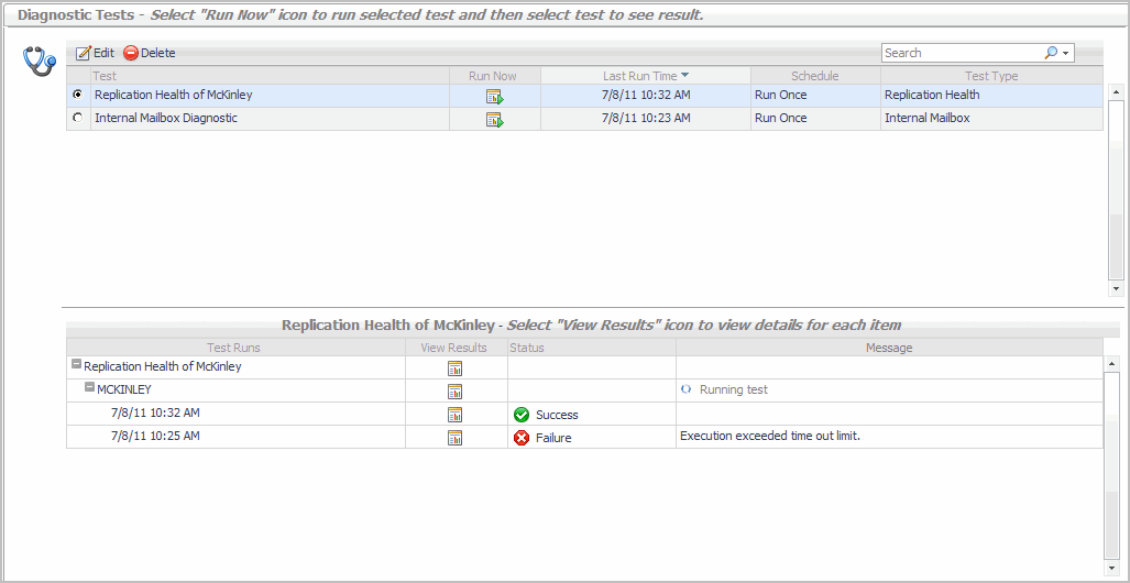 The remainder of this dashboard consists of the Diagnostic Tests list. As tests are created using the Create New Diagnostic Test wizard, the test parameters specified in the wizard will be displayed for each new test created. From this list, you can select the Run Now icon to run the test or select a test to view the test results.