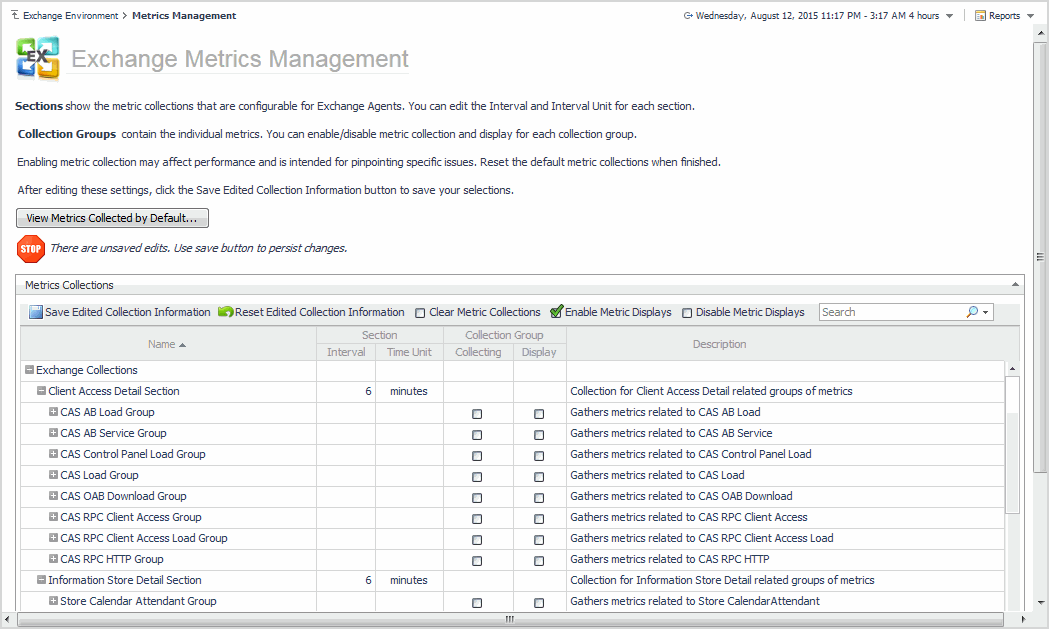 The Exchange Metrics Management dashboard lists the metrics that can be optionally collected by an Exchange agent. Using this dashboard, you can enable these metrics to pinpoint specific performance issues or to modify the interval to be used to collect data.