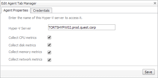 On the Hyper-V Environment dashboard, on the Administration tab, select an agent instance and click Edit Properties (see Configuring monitoring agents ).