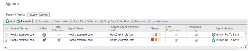 On the Administration tab, under Agents, open the Hyper-V Agents or the SCVMM Agents tab, as required.