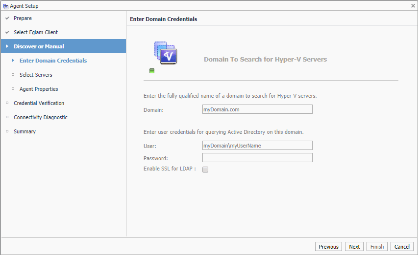 Discovering Hyper-V Servers only. On the Enter Domain Credentials page that appears, specify the information needed to search for the running Hyper-V Servers.