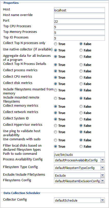 Collector Config: defines how quickly the agent collects data. UNIX® provides a defaultSchedule configuration. Users can modify, clone, and delete configurations, as necessary. |