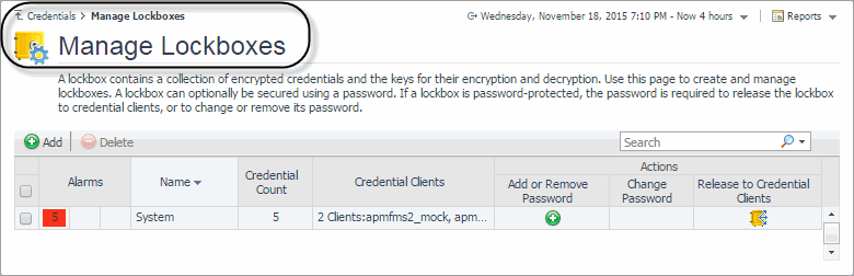 After creating the credential, you must ensure that the lockbox in which the credential is created is released to the Foglight Agent Manager associated with the PowerVM HMC Agent instance that you are about to create (see Creating PowerVM HMC agents). You can release a credential to a desired Agent Manager using the Manage Lockboxes dashboard. To access this dashboard, on the navigation panel, under Dashboards, click Credentials. On the Credentials page, click Manage Lockboxes.