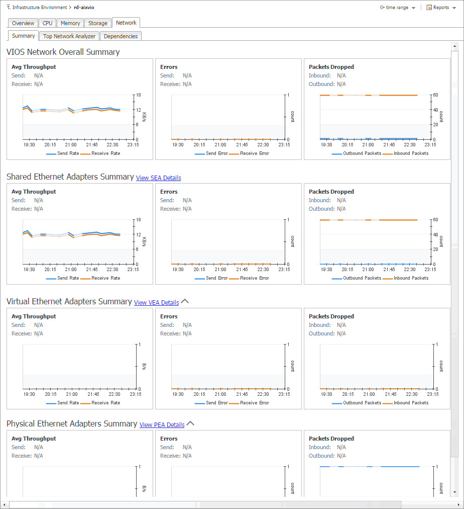 The Summary tab on the Network tab of the PowerVM VIOS detail view provides information all network adapters associated with the selected PowerVM® VIOS, shared ethernet adapters, virtual ethernet adapters, and physical ethernet adapters. Use it to find out if any specific collection of adapters exhibits low throughput, high levels of dropped packets or errors, to maintain the stability of your system and ensure optimum network throughput levels.