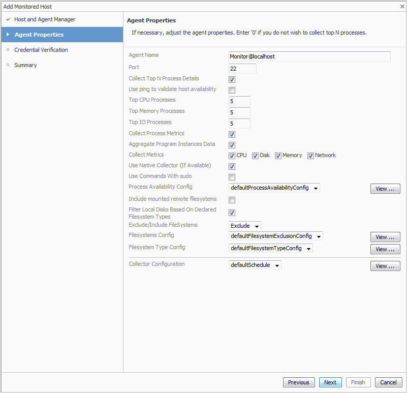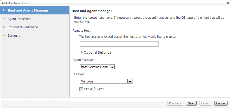 In the Add Monitored Host wizard, on the Host and Agent Manager page, specify the host that you want to monitor. |