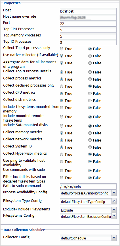 Collector Config: Defines how quickly the agent collects data. UNIX® provides a defaultSchedule configuration. Users can modify, clone, and delete configurations, as necessary. |