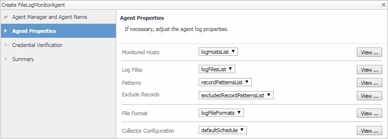 To create an agent instance, activate it, and start its data collection, use the appropriate wizard (Create FileLogMonitorAgent or Create WindowsEventLogMonitorAgent), accessible from the Log Monitor dashboard.